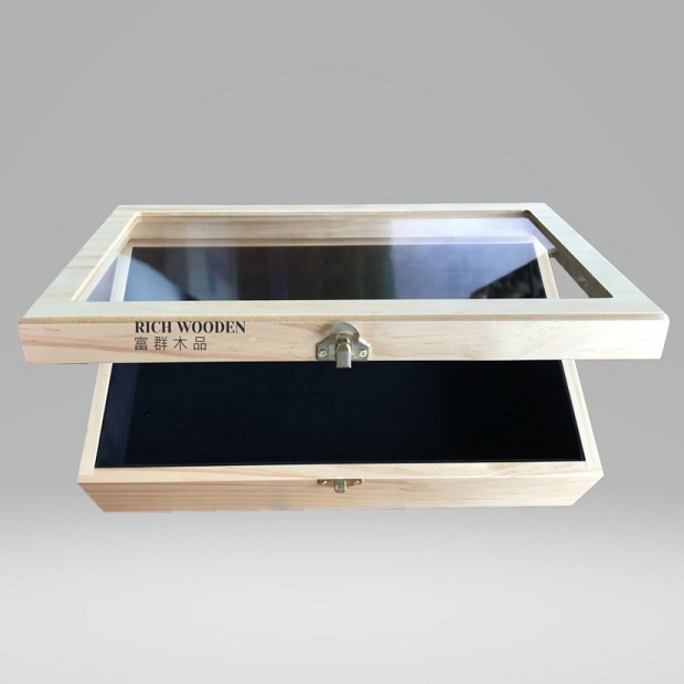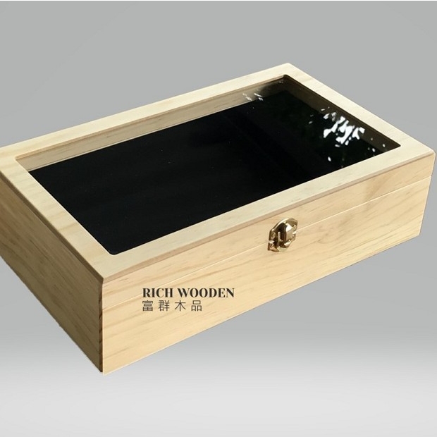 產品介紹 : 採用松木及MDF貼雙面松木皮製作,表面僅一般噴漆處理,上蓋開窗設計並組裝透明壓克力板,掀蓋方式製作,盒內貼黑色絨布內襯。
