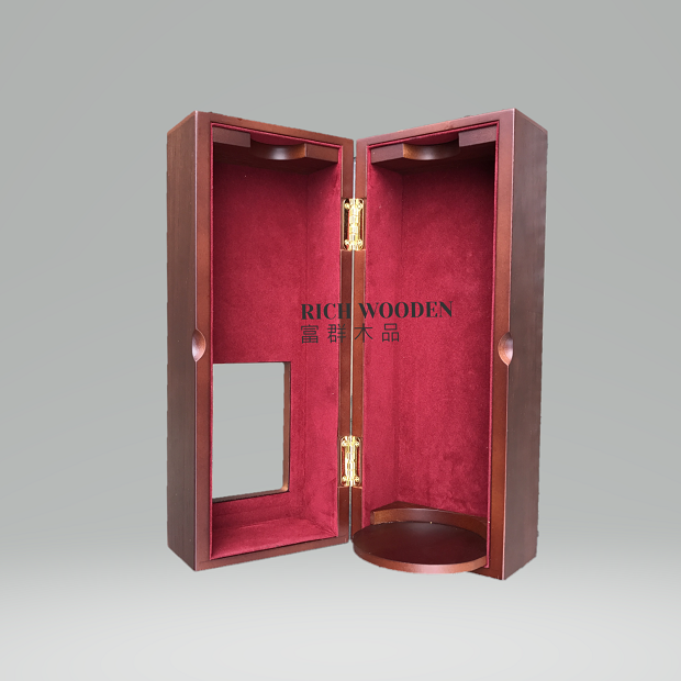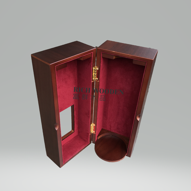 產品介紹 : 採用MDF貼雙面胡桃木皮製作,表面內外一般噴漆處理,胡桃木紋質感搭配酒紅色絨布內襯,可依照酒瓶尺寸訂製。