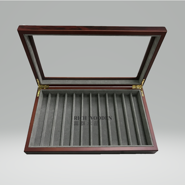 產品介紹 : 採用MDF貼花梨紙皮製作,上蓋面開窗設計,各式收藏鋼筆展示,表面內外一般噴漆處理,內裏及隔板包覆灰色絨布,提昇整體質感。